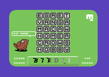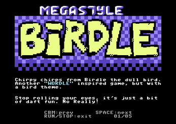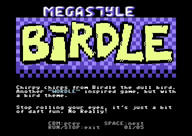-"Hello C64 fans, especially those of you who like Wordle. Introducing Birdle the dull bird (real name actually Dullbert) with a new Wordle style game. This time though, you guessed it.... all words are based on birds or bird related.
