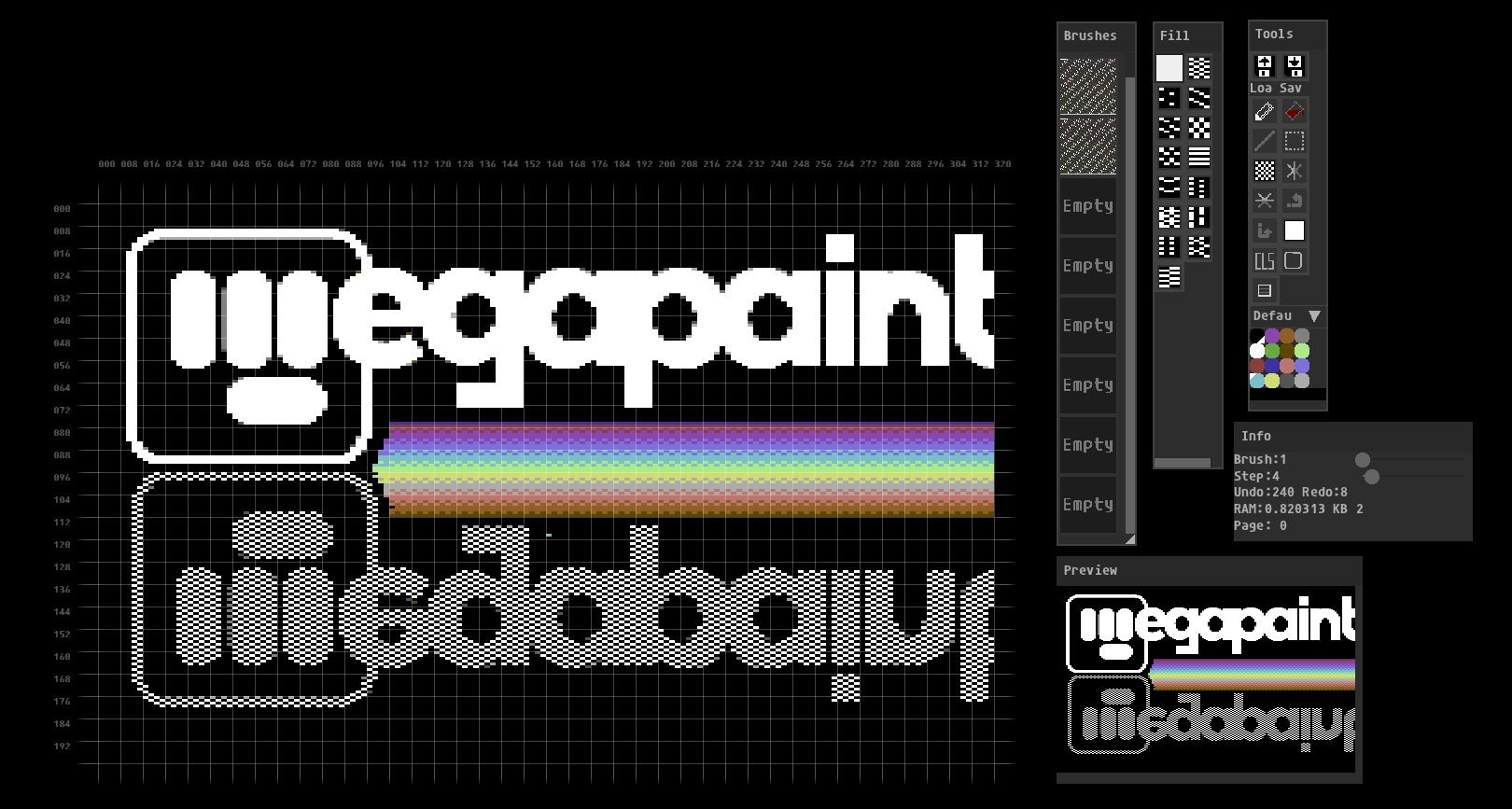 Megapaint is a Pc tool for Commodore 64 artitsts who wants to create koala pictures. With Megapaint you have 16 pages to paint with. You can use these for animations, or a page or two of brushes you like ( you have plenty, treat yourself ). You can paint with either a rectangle, a circle, or a brush you made yourself.